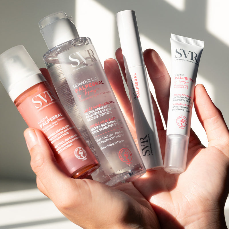 Palpebral Crème, le soin n°1 du contours des yeux hypersensibles chez SVR. Crème apaisante anti-grattage paupières irritées lié à la sécheresse cutanée. Tolérance, efficacité et plaisir, sont réunis pour apaiser le regard.